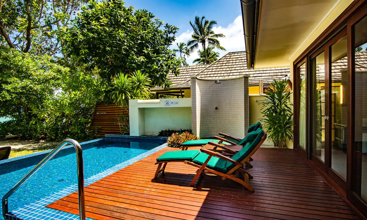 Each villa is appointed with deluxe bedding, a flat-screen TV, a DVD player, and a cozy sofa. Select villas also offer breathtaking views of the Indian Ocean.