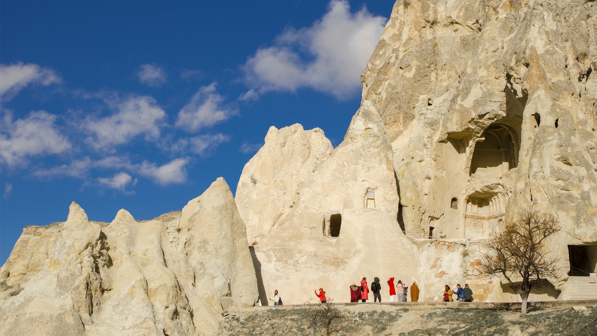 Selime Monastery is an astonishing rock cut structure incorporating a vast kitchen and soaring chimney. A church with a gallery all around it, stables with feeding troughs and other evidence of the